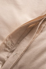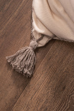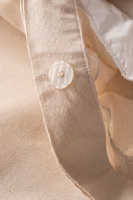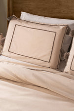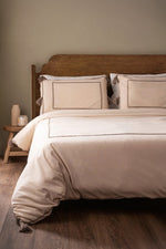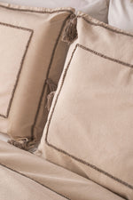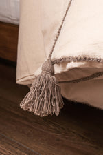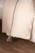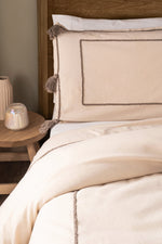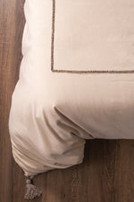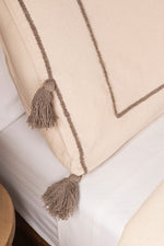 Funda de acolchado o edredón con bordado y borlas hecho en India en color visón en una base de color crudo, un diseño que le da un toque Boho a tu habitación. Viene con dos Fundas de almohada.