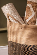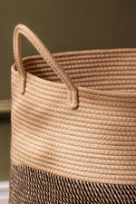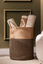 Contenedor en algodón pesado combinado en color Beige y Negro ideal para usar como cesto de laundry de gran capacidad tiene 38 cm de diámetro por 50cm de alto.
