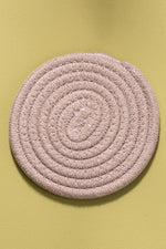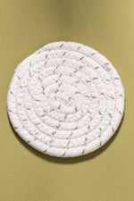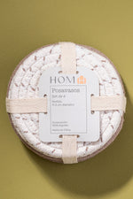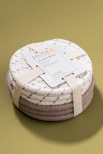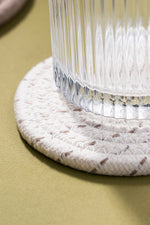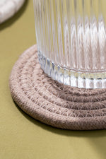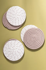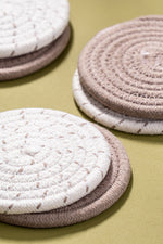 Set de 6 posa vasos combinados en colores crudo y visón de 11.3cm de diámetro fabricados en soga de 100% algodón. De estilo moderno y Boho estos versatiles posa vasos pueden usarse tanto en la mesa acompañando los indiviuales o solos en cualquier evento.