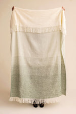 Manta tejida degrade con flecos de 130cm de largo por 200cm de ancho, ideal para cubrir el pie de tu cama o mantenerte abrigado en el living de tu casa. Este diseño viene en dos opciones de color verde o peach, ambos, super fuertes esta temporada.