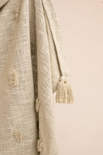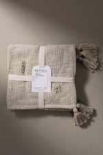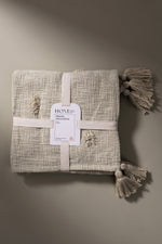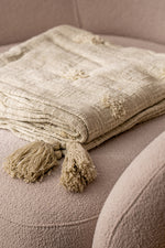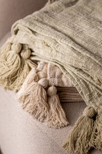 Manta hecha a mano en India de 100% algodón con detalles de pompones y borlas en las puntas.  Estos adornos en las puntas de la manta añaden un toque de frescura y estilo boho. Los pompones y borlas son perfectos para dar un aire relajado y estiloso a tu decoración. Además de ser funcional, esta manta se puede usar como una pieza decorativa en camas, sofás o incluso en tu terraza o jardín, aportando un estilo relajado y moderno.