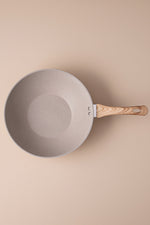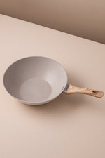 Sartén WOK de aluminio forjado de 3.8 mm en los bordes, cuerpo de 2.2 / 2.8 mm y base de 3 mm. Apto cocina inducción, Gas, vitrocerámico y Eléctrica. Altura x Ancho: 9cm x 30cm. Con mayor propiedad antiadherente de 3 capas efecto granito color beige, este recubrimiento múltiple resiste muy bien la abrasión y los rayones y el mango símil madera de tacto suave y antitérmico permite manipular durante la cocción sin quemarte.