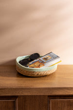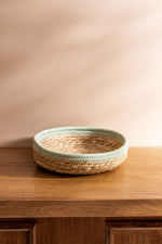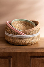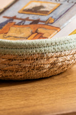 Cesto multiuso de yute tejido con borde color de algodón de 21cm de diámetro por 7cm de alto.