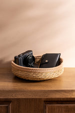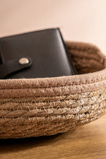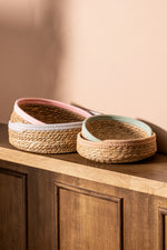 Cesto multiuso de yute tejido con borde color de algodón de 24cm de diámetro por 8cm de alto.