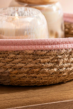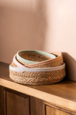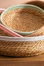 Cesto multiuso de yute tejido con borde color de algodón de 27cm de diámetro por 9cm de alto.