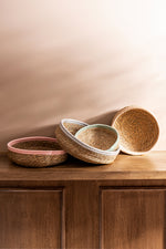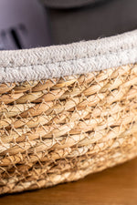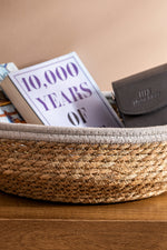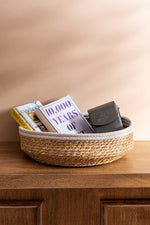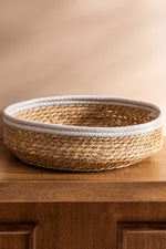 Cesto multiuso de yute tejido con borde color de algodón de 30cm de diámetro por 10cm de alto.