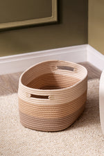 Contenedor de algodón pesado con triple raya combinada de color Off white, beige y visón de 37cm de largo por 25 de ancho por 22cm de alto.