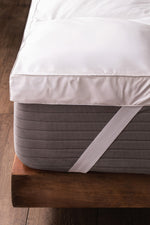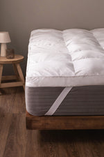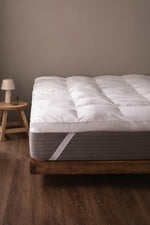 Topper de colchón de calidad premium en 100% algodón de 233 hilos desmontable con bandas elásticas en cada esquina. Tiene un relleno de fibra siliconada de 1600gr/m2 de 8 cm de altura para brindándole un plus de confort a tu colchón.